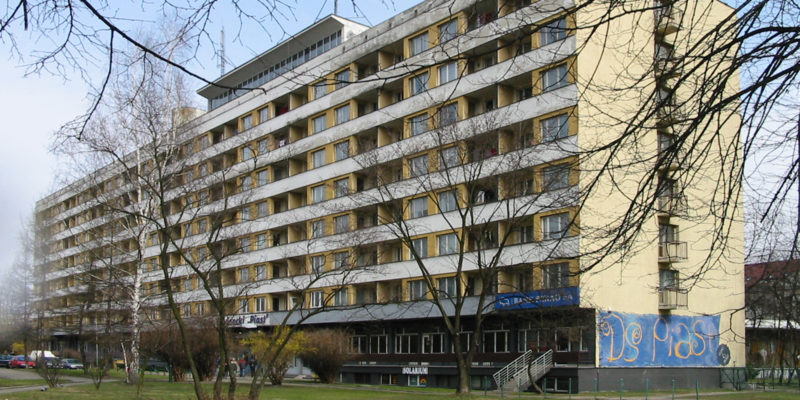 Budynek zrealizowany w ramach inwestycji z okazji 600-lecia Uniwersytetu Jagiellońskiego, pierwotnie jako hotel dla zagranicznych studentów. Składa się z dwóch brył: głównej o funkcji mieszkalnej z zapleczem socjalno-usługowym oraz baru samoobsługowego — stołówki. Rozrzeźbienie elewacji loggiami wydobywa „światłocień”. Bryłę podkreśla układ poziomych pasów podokiennych przechodzących w balustrady, a całość wieńczy dawna świetlica o łukowo wygiętym dachu. Pierwotnie w stonowanej kolorystyce: biało-szaro-niebieskiej. Budynek pawilonowy wyróżniała do 2016 roku przełamana, częściowo perforowana regularnymi kwadratami i częściowo przeszklona, elewacja z „przebijającą” ją abstrakcyjną rzeźbą — stanowiącą kompozycję zarówno ogrodową jak i wewnętrzną, zawieszoną nad fragmentem trawnika przechodzącym z tarasu do wnętrza. Rzeźba decyzją administracji budynku została usunięta, a mozaiki częściowo zniszczone. Nagroda II stopnia Komitetu Budownictwa Urbanistyki i Architektury, w 1964 roku.